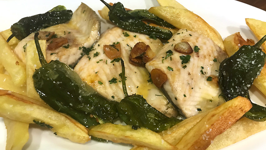 Sirve acompañado de las patatas y los pimientos de Padrón.