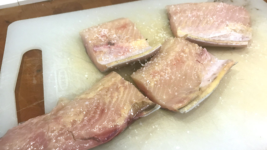 El pescadero te habrá sacado los lomos del esturión. Comprueba que no tengan espinas y córtalos en 3 o 4 trozos cada lomo.