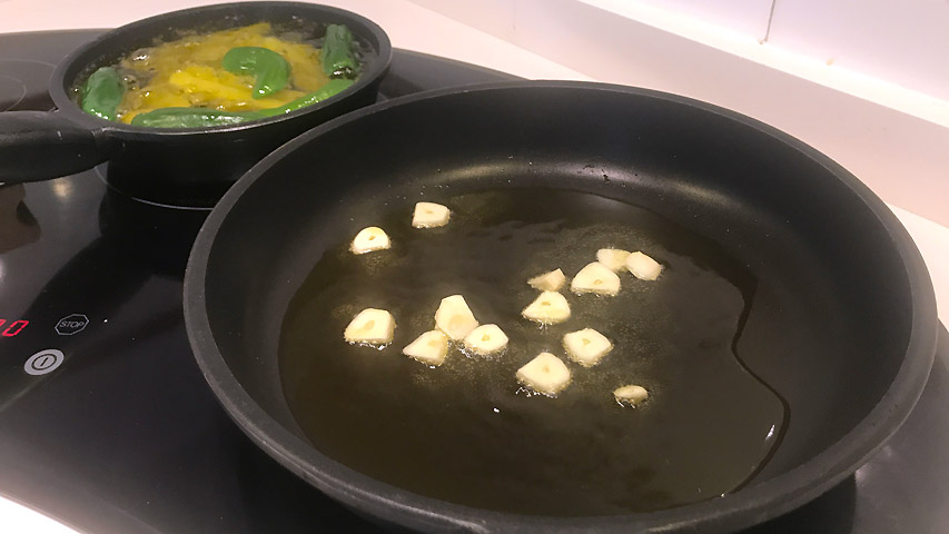 Prepara una sartén con aceite de oliva y los ajos laminados a fuego medio-alto (7/10).