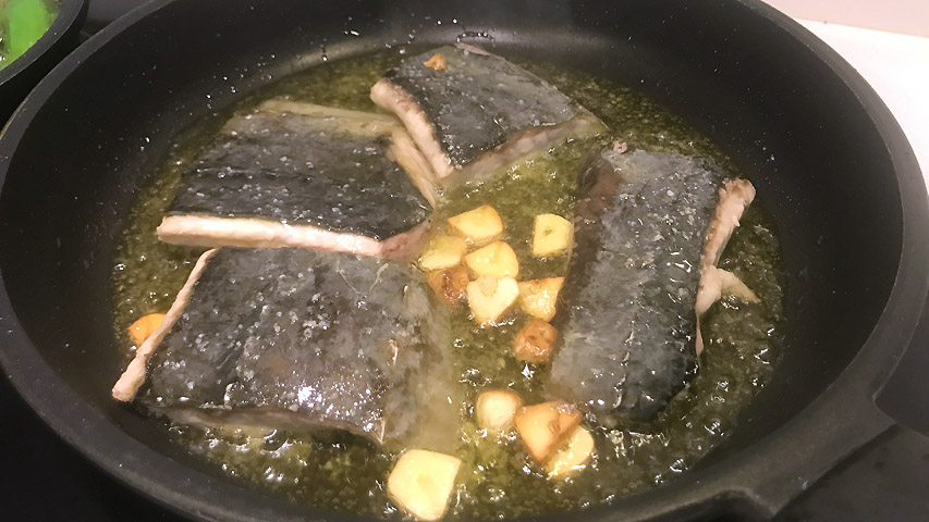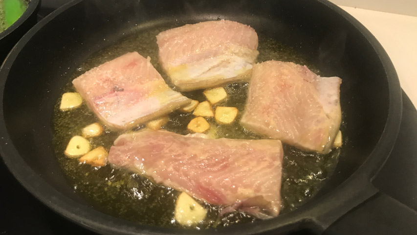 Mientras frío las patatas y los pimientos de Padrón preparo la sartén para hacer este lomo de esturión al ajillo.
