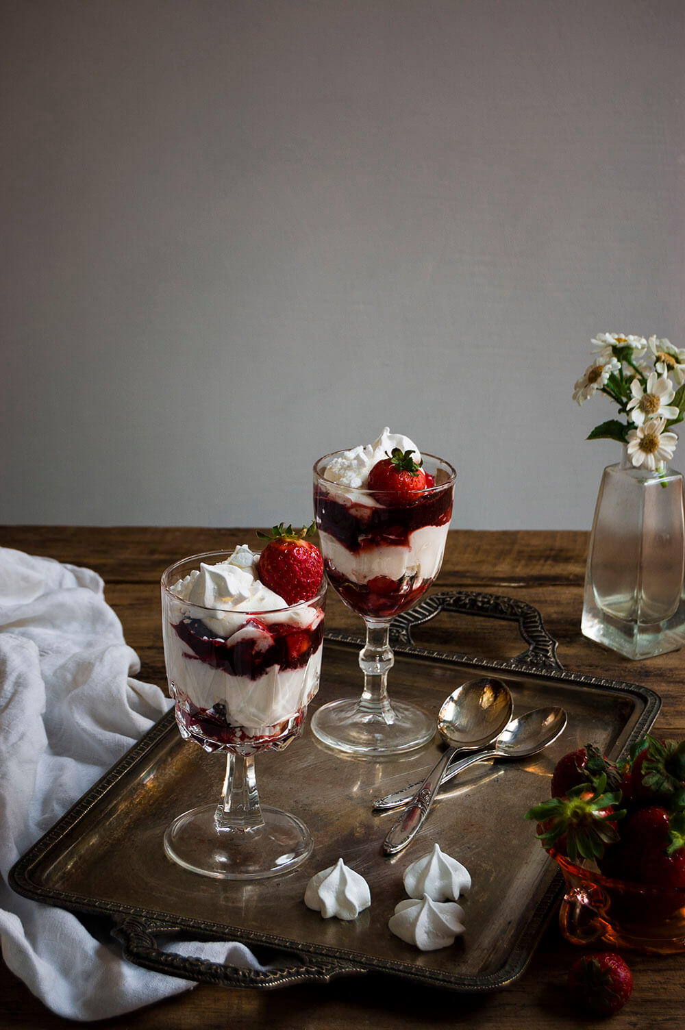 En un vaso pon un poco de la salsa de fresa junto con unos trozos de fresa picada. Pon encima unas piezas del merengue roto y después un poco de la nata (crema de leche). Sigue este proceso hasta llenar el vaso. Termina con nata montada (crema de leche).