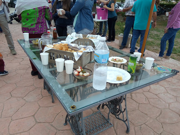 Además de queso y jamón ibérico, se presentó un variado de aceitunas y banderillas, elemento que al cumpleañero le encanta, ensaladilla de gambas, vasitos de salmorejo, tortillas de patata, cazuelita de carrillada en salsa de vino tinto, cóctel de frutas con chocolate caliente con especias, tarta húmeda de chocolate con almendras, bizcocho de naranja, café e infusiones.