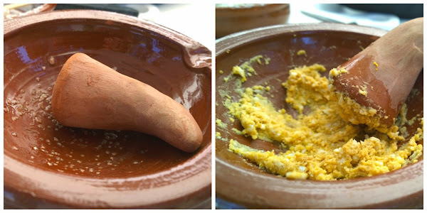 Realizamos dos preparaciones para poner encima de una rebanada de pan: una con base de crema de queso fresco (podría ser San Millán o Philadelphia), pasas, apio, nueces, aceite, vinagre, sal, pimienta y miel. La otra, con garbanzos cocidos, huevo duro, semillas de mostaza molida, sal, pimienta, aceite, vinagre, miel y vino rancio. Lo mejor de todo, el mortero utilizado. Una pieza reproducida para la ocasión y que funciona perfectamente.