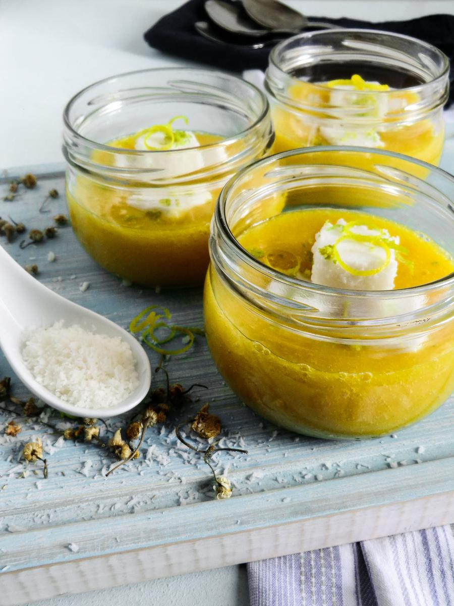 Y es que la combinación del mango con el toque de jengibre, es una verdadera explosión de sabor en la boca. Es una crema suave y untuosa, acompañada por unos blancos cuadritos de gelatina de coco, hecha en leche de almendras. Y para rematar toda esta sinfonía de sabores frutales y orientales; ralladura de naranja y limón.