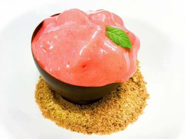 El postre estaba muy equilibrado, la acidez de la espuma de frambuesa maridaba muy bien con el amargor del chocolate negro y el toque dulce del cramble de galletas.