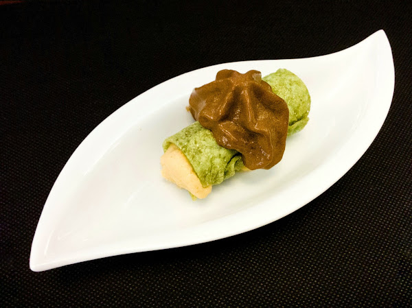 Canelón crujiente de lechuga de mar, crema de maragota y espuma de ajo negro (2€)