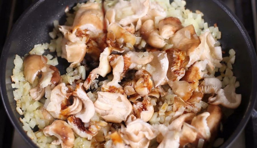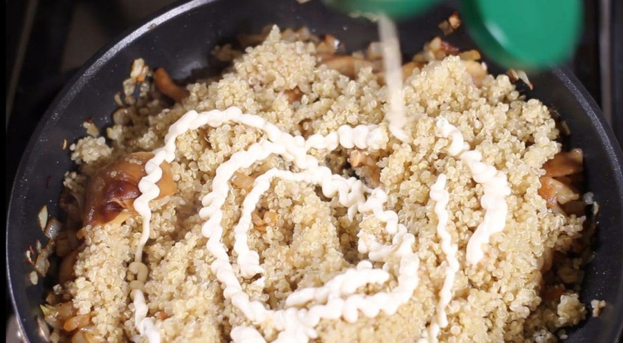 Por otro lado, salteamos en una sartén, con un poco de aceite de oliva, cebolla picada con un poco de sal. Cuando empiece a coger un poco de color, agregamos las setas lavadas y troceadas y, también, la salsa de soja. Moveremos para que se integren bien los ingredientes y llegará el momento, entonces, de incorporar la quinoa.