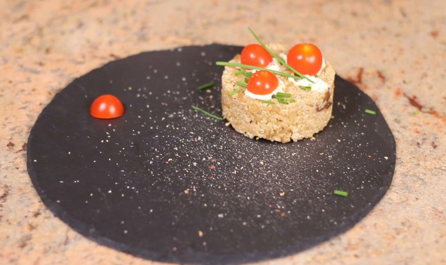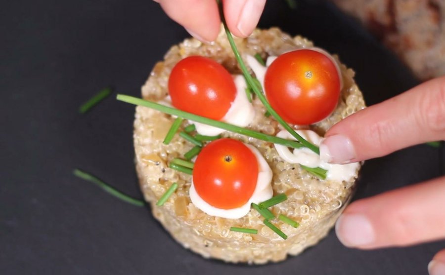 Para que quede vistoso, usaremos un aro. Lo colocaremos en el centro del plato escogido y con una cuchara echaremos la quinoa hasta casi llegar al borde del mismo. Quitamos el aro de emplatar y decoramos al gusto, aunque nosotros aconsejamos ponerle un poco de cebollino, algo más de ajonesa, unos tomates cherry y un poco de pimienta.