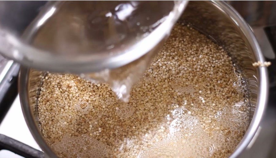 Para preparar el plato comenzamos cocinando la quinoa. Primero hay que lavarla bien bajo el grifo y, después, cocerla unos 20 minutos. Una vez lista la reservamos.