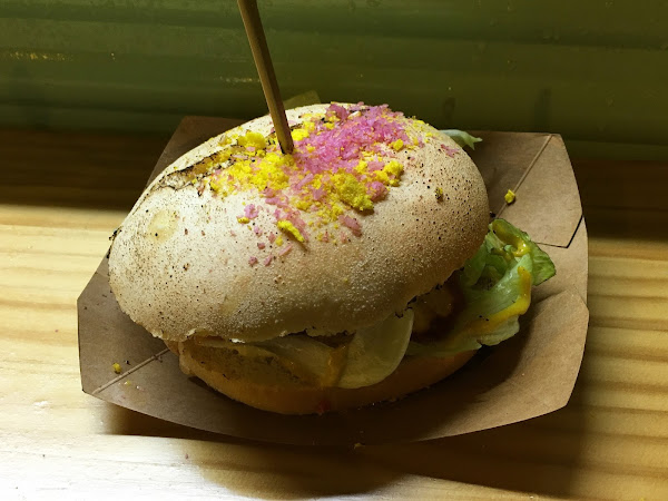 Después, seguimos dando una vuelta y nos pedimos una hamburguesa de carne Black Angus en la food truck Lucías, donde nos la prepararon en el momento mientras uno de los cocineros hablaba con nosotros. Nos encantó el detalle de echar los polvos de color amarillo y rosa por encima de la hamburguesa por su originalidad. Nos costó 6€.