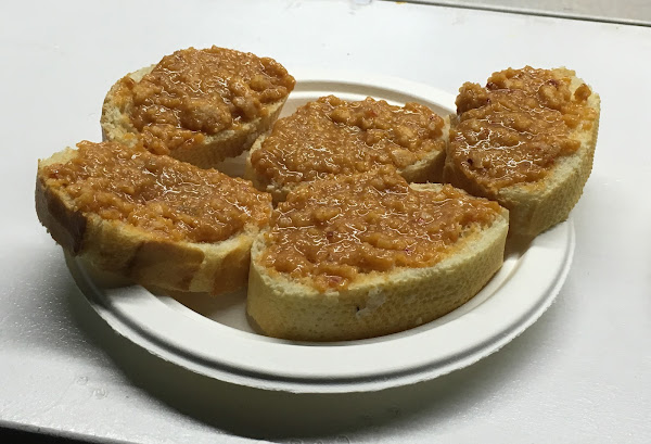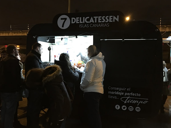 Pero sí tuvimos ocasión de probar 4 platos diferentes, en el food truck 7 Delicatessen Canarias pedimos unas papas arrugás con mojo picón y unas tostas de queso majorero. Nos gustó mucho que las papas vinieran con las dos clases de mojo, verde y rojo, para poder probarlos, ya que eran caseros. Los dos nos gustaron mucho, igual que las tostas con queso majorero, un queso canario que nos encanta porque su sabor ahumado es espectacular. Cada una de estas tapas nos costaron 5€.