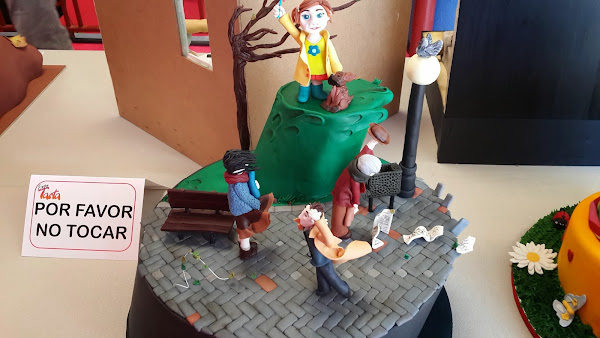 No encuentro las palabras para deciros lo que me transmite esta tarta, al principio pensé, vua que simple, pero me quede mirándola. Gente normal en la calle y los objetos en movimiento del viento que hace. Me dejo alucinada de verdad. me la hubiera llevado a casa.