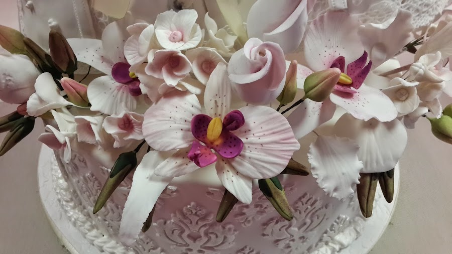 Tarta en blanco con tranajo muy limpio y esta maravilla de flores, parecen de verdad.