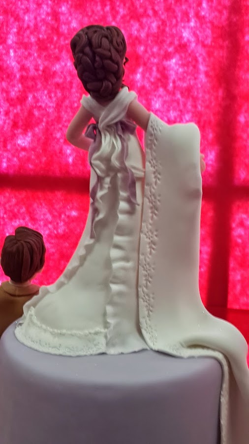 Preciosa tarta de boda con sus novios incluidos, lo mejor la parte trasera del vestido de novia que llegaba hasta abajo de la tarta.