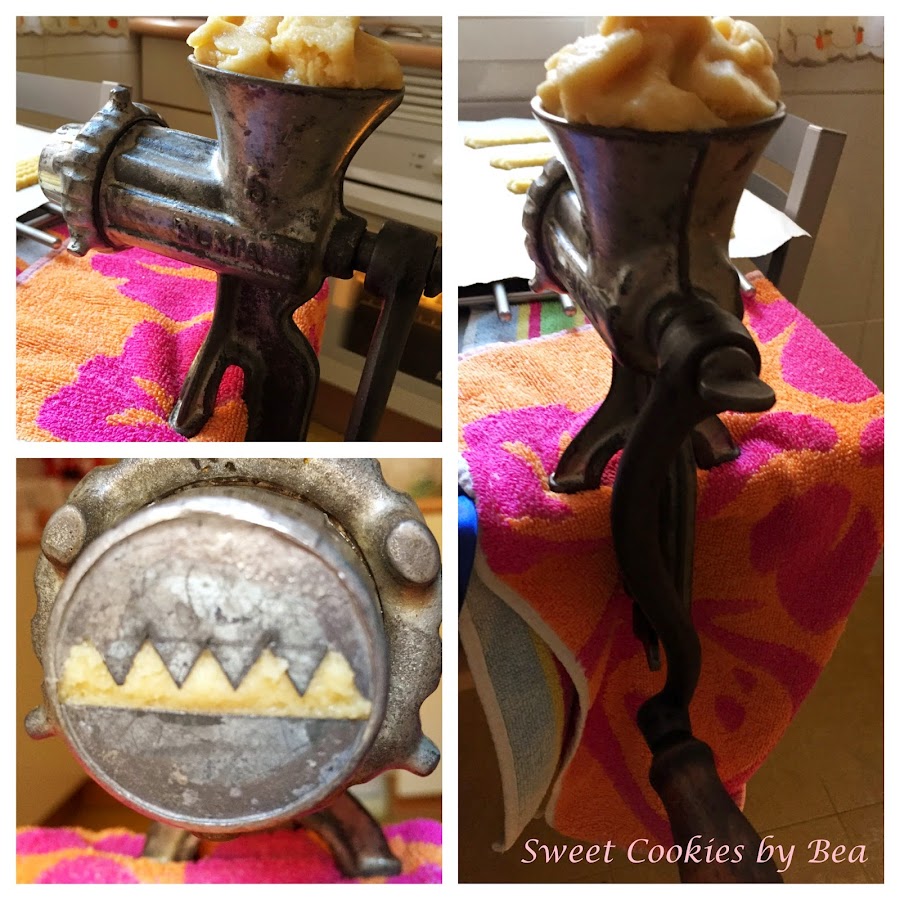 Y ahora a darles forma, esta es la máquina con la que lo hago, si si es muy antigua, pero bueno también puedes usar un molde y con el rodillo hacerlo, o haces una bolita con las manos y le das forma alargada apretando con los dedos ....