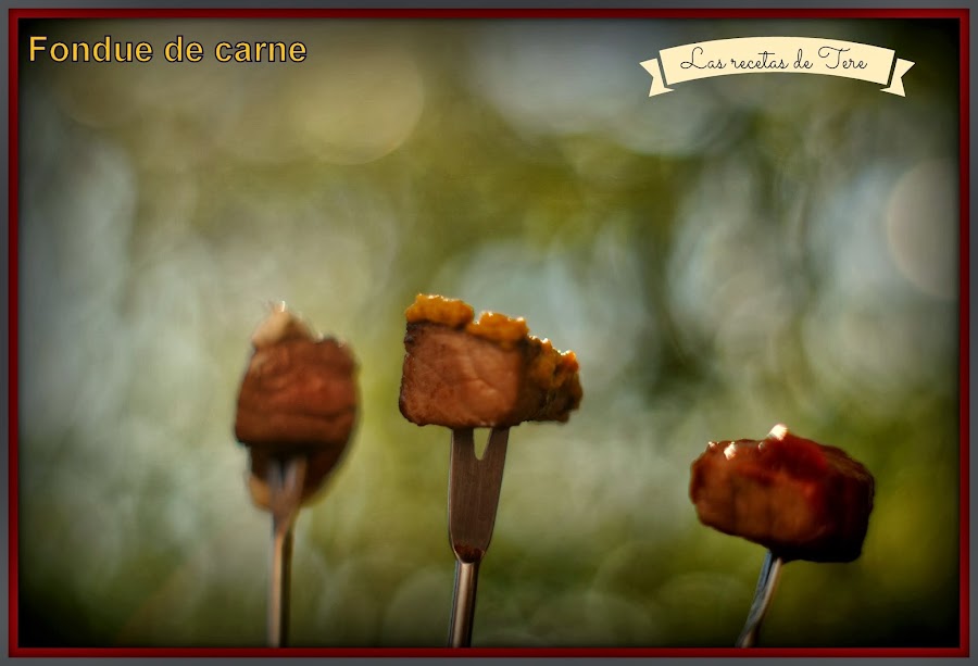 Ahora lo que nos queda es poner a calentar el aceite en la olla de fondue junto con los cubiertos para tal fin, la mía es eléctrica (es maravillosa, la compré en Amazon...jajaja), junto con las salsas, cada quién se sirve lo que desee y cuanto desee, insertas una carne en el cubierto, metes a freír en la olla y en menos de un minuto sale la carne ya hecha, mojas con la salsa y a comer!!! Como os dije, es una plato muy ameno y participativo de comer, así que tómate tu tiempo y disfruta!!