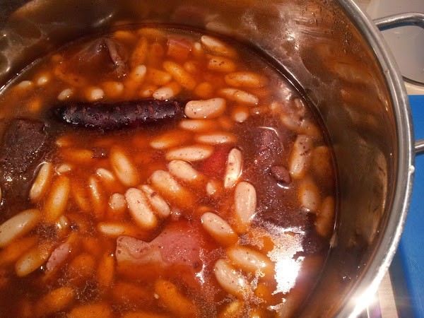 Dejamos que todo vaya cociendo con tranquilidad durante 2 horas y media (vigilando, como ya he comentado, que siempre estén cubiertas las fabes)