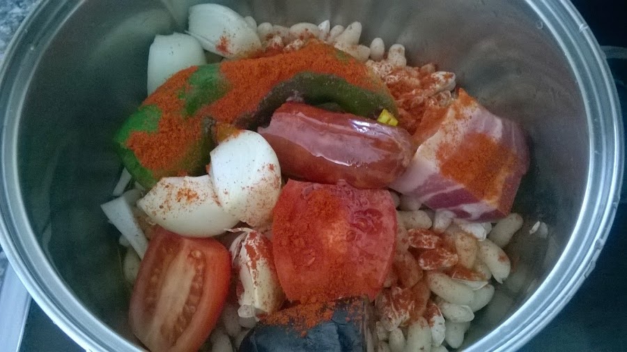 el tomate, el Pimiento verde la Cebolla y el ajo entero pelado,la morcilla y el chorizo, el tocino con veta, y el laurel, y una pizca de pimentón