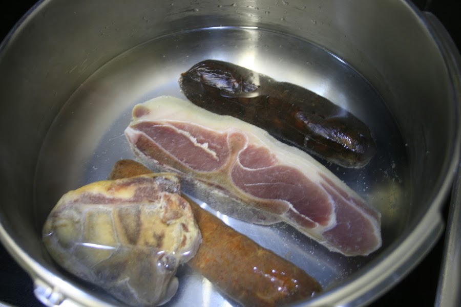 Ponemos en la olla, la morcilla, el chorizo, la panceta y el hueso de jamón y los cubrimos de agua y dejamos que empiece a hervir.