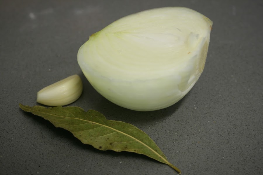 Cuando lleven hirivendo unos 15 minutos, añadimos, la media cebolla, el ajo y la hoja de laurel.
