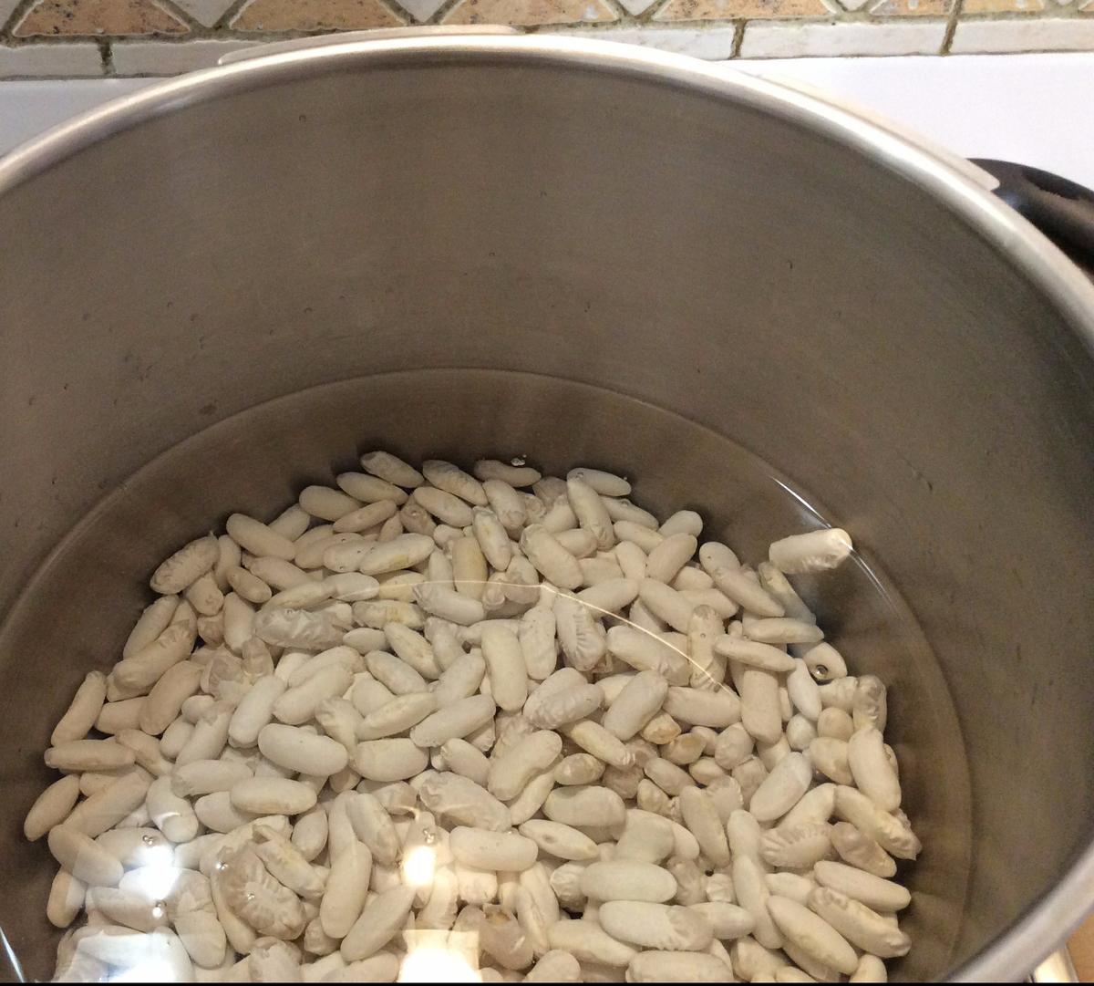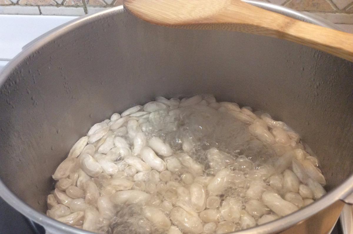 Lavamos tres veces con agua fría las fabes. Lavamos y dejamos escurrir, 3 veces.