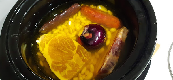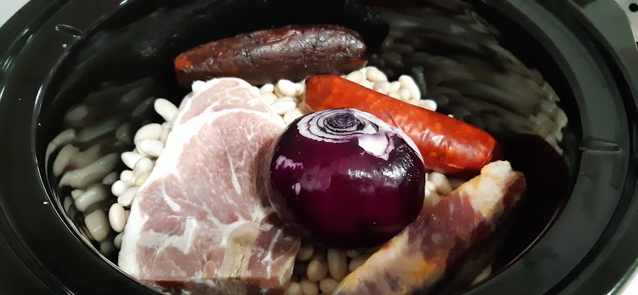 2.- En la Crock Pot, colocamos las judías blancas, el chorizo, la morcilla, el lacón, la panceta, la cebolla y los ajos.