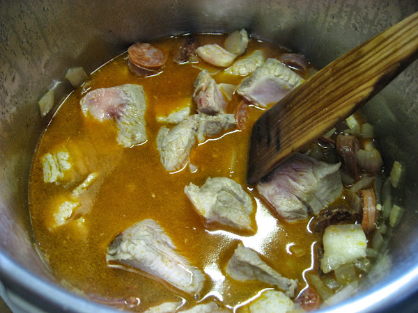 Y en este caso le puse un poco de costilla de cerdo que tenia por la nevera y le dio algo más de condimento al plato, aunque creo que no lo necesita.