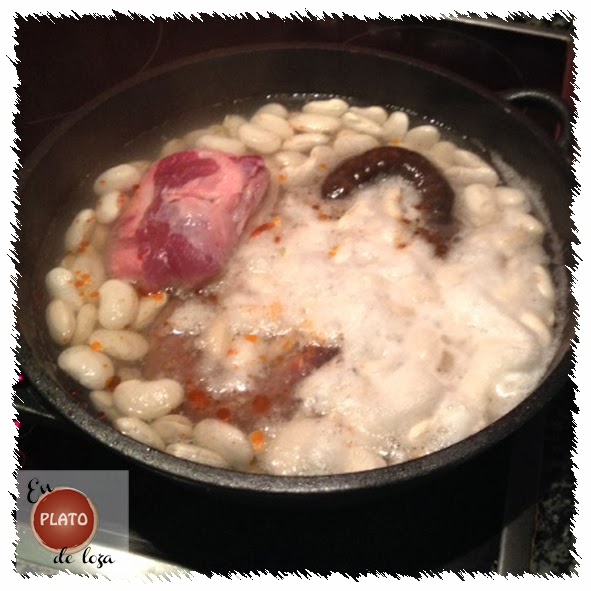 Empezamos poniendo las fabes a calentar a fuego alto. Antes, hemos quitado las que se hayan abierto. Dicen los entendidos que es mejor utilizar el agua misma donde la hemos tenido en remojo. Lo que sí es importante, al menos para mí, es que hay que cubrirlas pero no pasarse con el agua porque la cocción será a fuego muy lento y no perderá apenas caldo y, sin embargo, sí iremos añadiendo poco a poco.