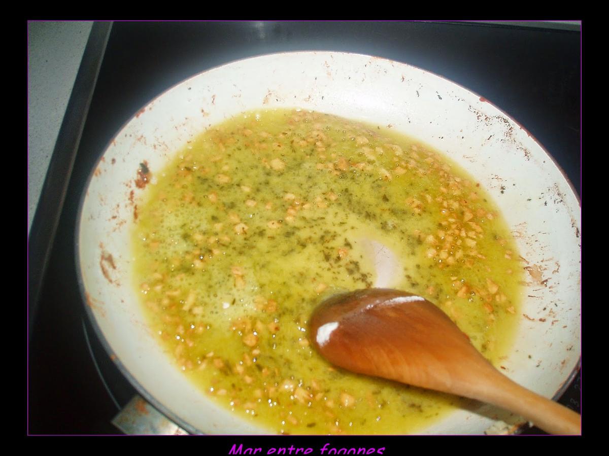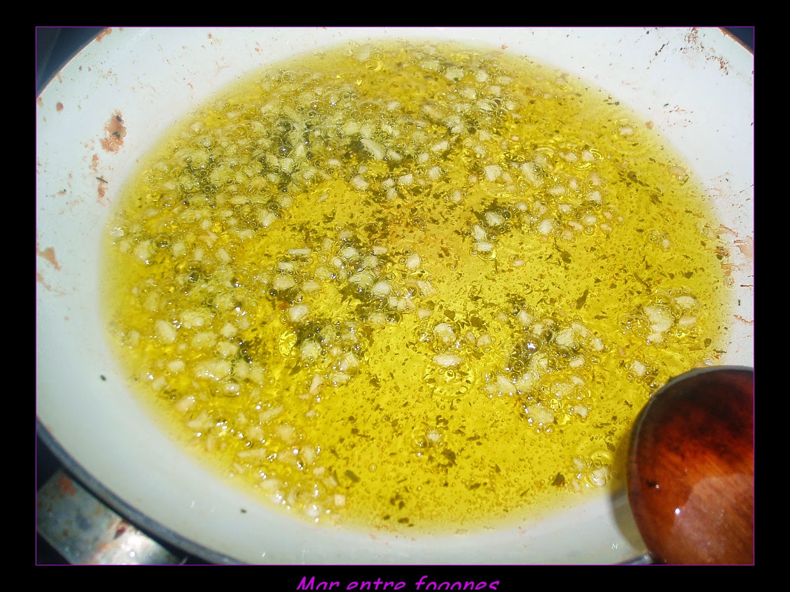 En una sarten, ponemos un chorrito de aceite y ajo picado pequeñito.