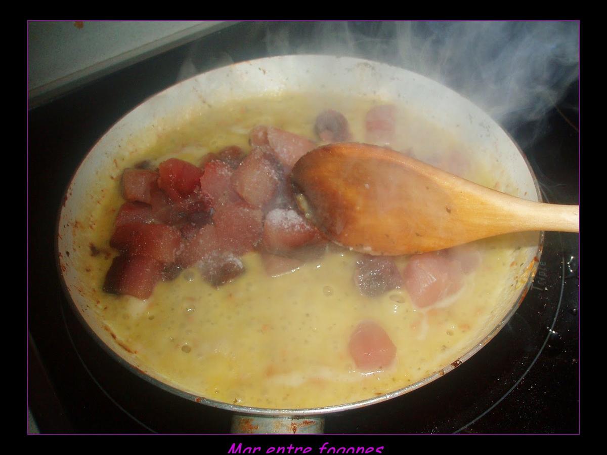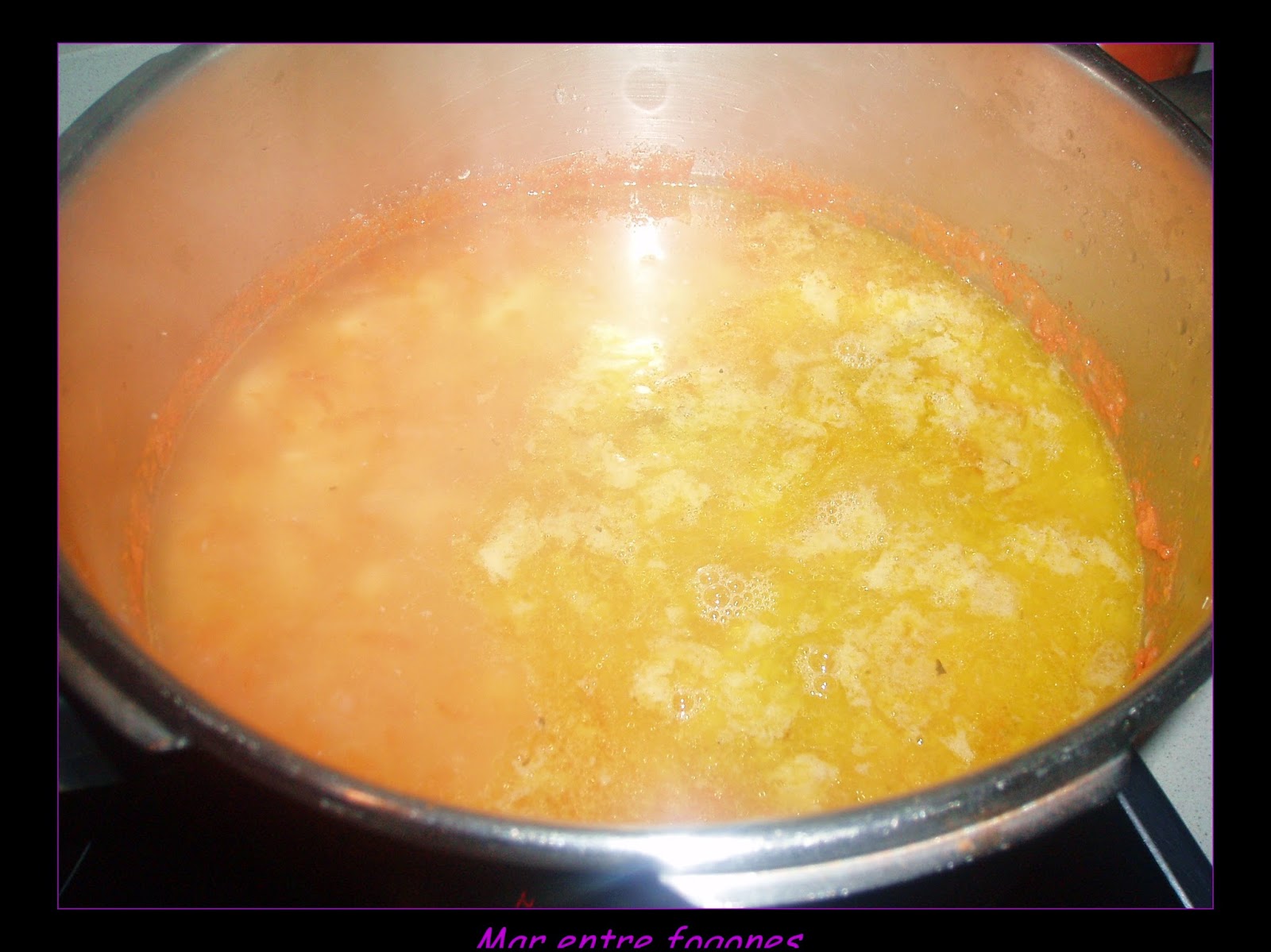 Añadimos a las fabas, damos un hervor para que se mezclen sabores.