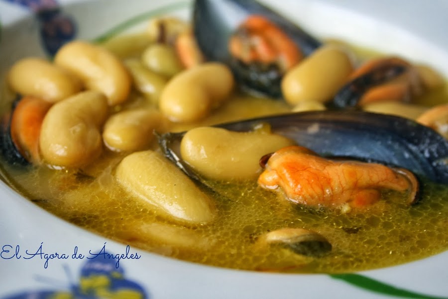 Ponemos ahora el caldo de los mejillones,comprobamos de sal y cocemos en olla rápida media hora.