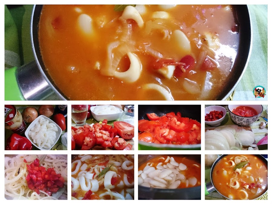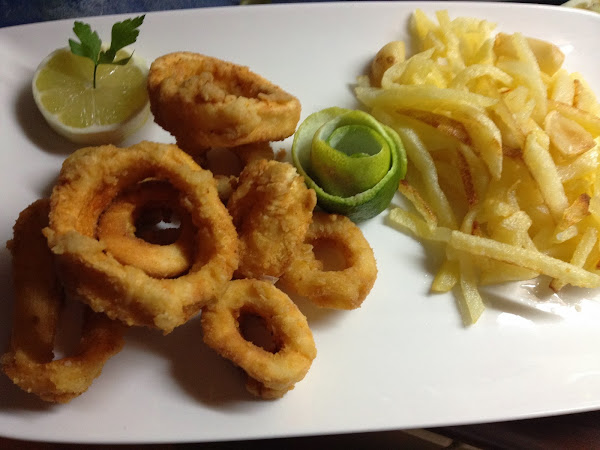 1/2 vaso de vino blanco, 300 gr de anillas de calamar.