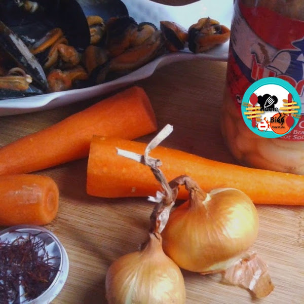 1.- Lavamos los mejillones. Los ponemos en una cazuela con agua, sal y 1 hoja de laurel. Los cocinamos a medio fuego hasta que se habrán todos. Retiramos los mejillones y reservamos el caldo.