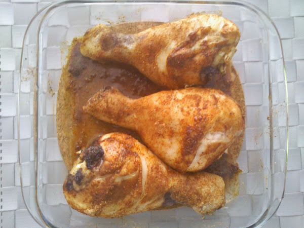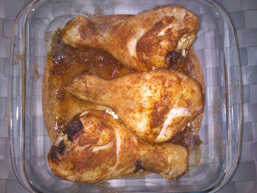 Precalentamos el horno a 200º arriba y abajo. Metemos en una bandeja apta para el horno los tres muslitos, los salamos, echamos las especias bien repartidas por todos lados y finalmente echamos un chorrito de aceite sobre cada muslo. No hace falta echar mucho aceite porque como hemos dejado la piel ya lleva grasa. Metemos en el horno y horneamos durante 35 minutos (el tiempo dependerá de la potencia de cada horno, el mío es bastante flojito). Sacamos y listo para comer!