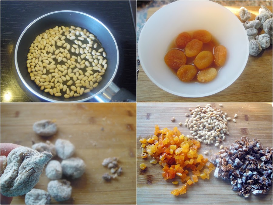 Quita el rabito de los higos secos y córtalos también en dados o cuadraditos.