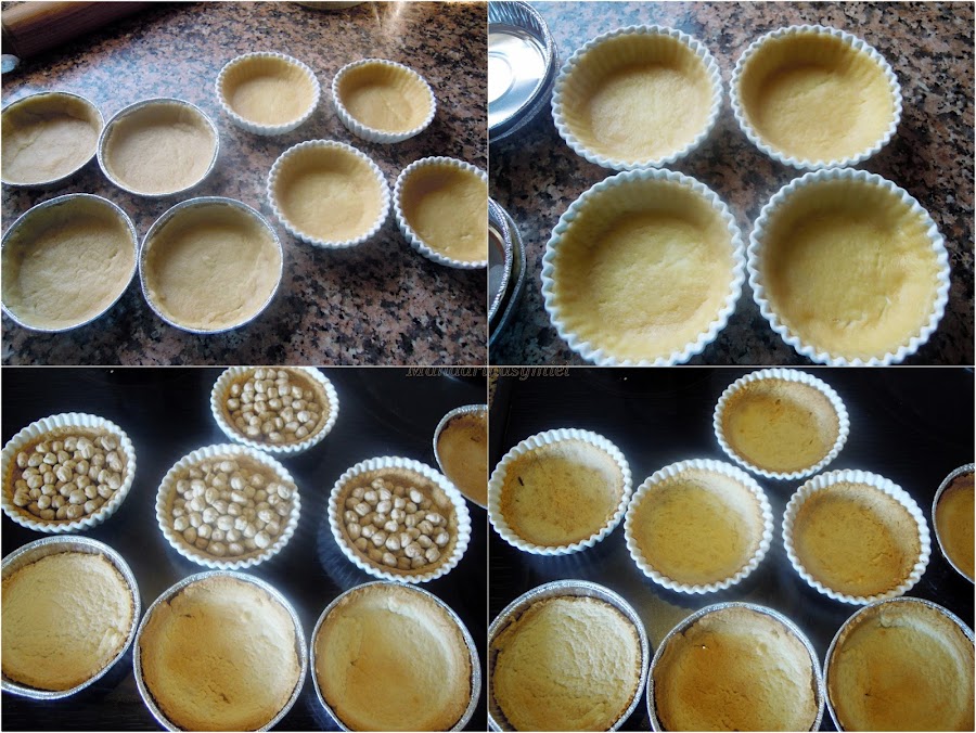 Coloca sobre cada tartaleta algo de peso para que no suba, puedes poner otro molde encima o garbanzos secos como he hecho yo.