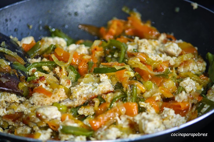 Cuando las verduras empiecen a tomar color, agregamos la carne de pollo salpimentamos a gusto y dejamos hasta que se haga.
