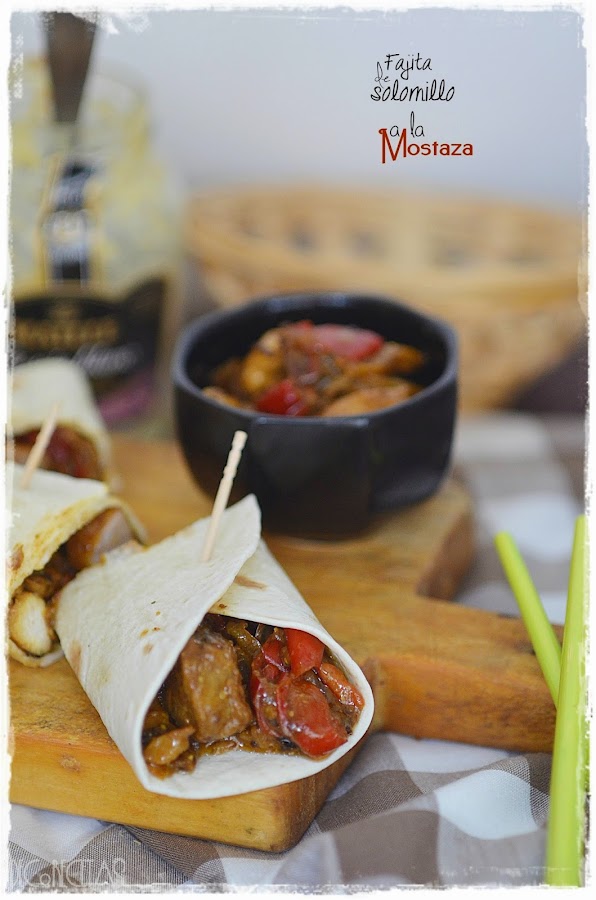 Primero realicé un pisto completo con cebolla, zanahoria, pimiento verde y rojo, calabacín, berenjena y setas variadas . Cortado todo muy menudito y pochando en el orden escrito en la anterior frase. Por último añadimos el solomillo picado en cubitos, salpimentamos, y cuando haya dorado, añadimos una buena cucharada de mostaza "Maille" en mi caso, y otra de tomate frito. Dejamos cocinar para que se mezclen todos los sabores por 10 minutos a fuego lento y solo tendremos que depositas en las tortitas de fajitas para disfrutar.