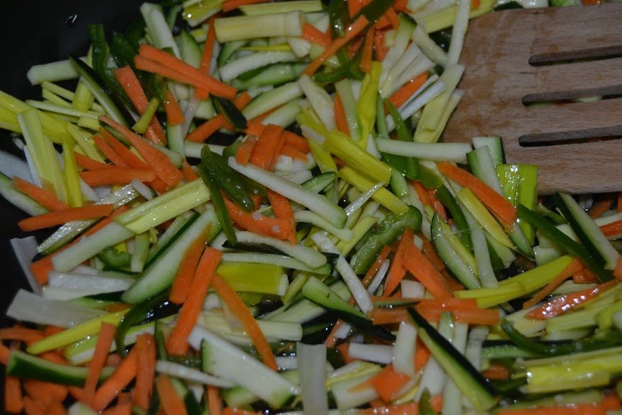 Ponemos en un perol un poco de aceite de oliva y todas las verduras cortadas en juliana.