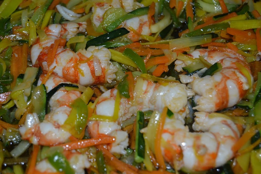 Añadimos un poco de sal y rehogamos todo, cuando la verdura este lista agregamos los gambones y terminamos de hacer, le añadimos un poco de pimienta molida.