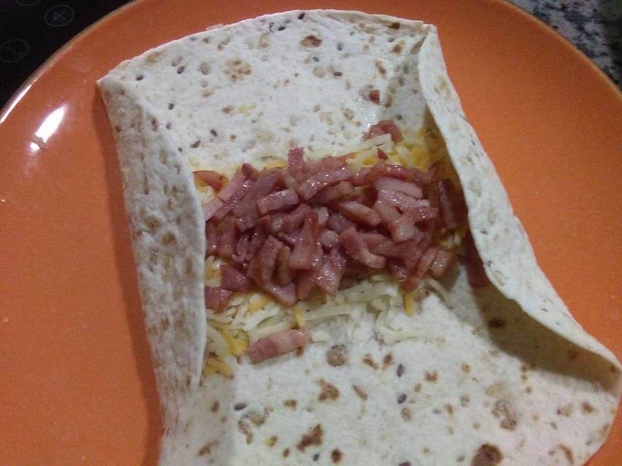 Freir un poquito el beicon. Colocar las fajitas y en medio poner el queso y encima el beicon. Doblar como veis en las fotos.