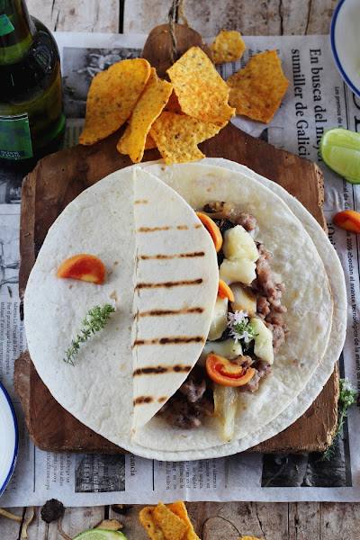 Ponemos una plancha a calentar, rellenamos las fajitas con la carne, le añadimos unos trozos de queso brie y calentamos en la plancha hasta que la fajita esté ligeramente dorada y el queso fundido