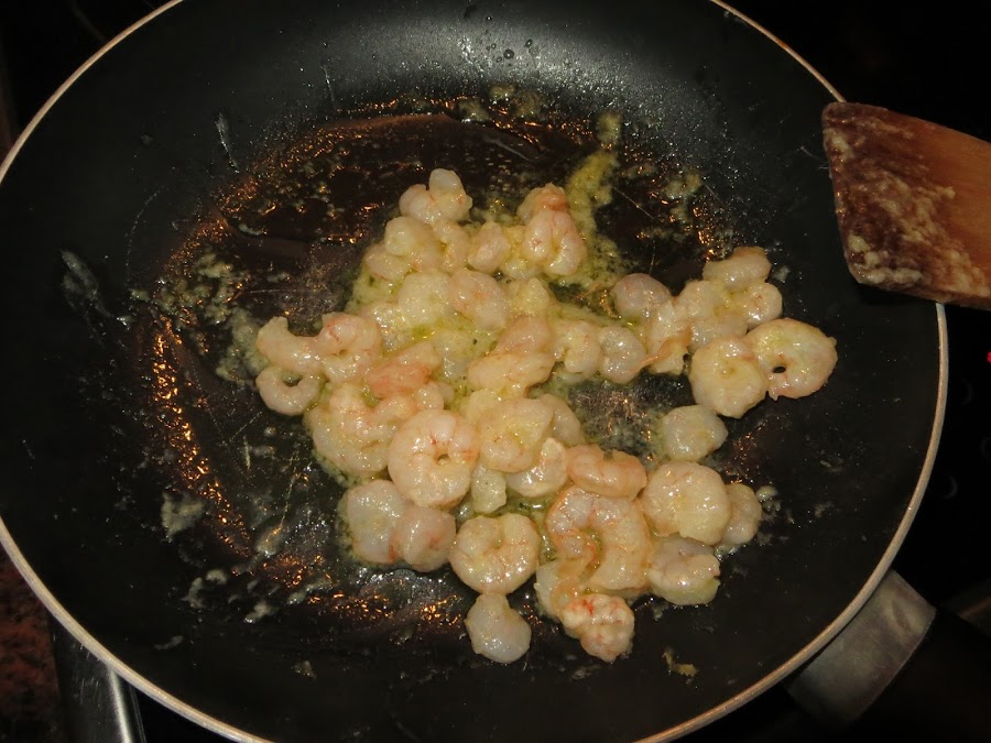 Si las gambas están congeladas, las sacáis unas horas antes del congelador para quitarles todo el agua. Echáis un poco de aceite en una sartén y añadís las gambas, las dejáis durante cinco minutos para que se hagan.