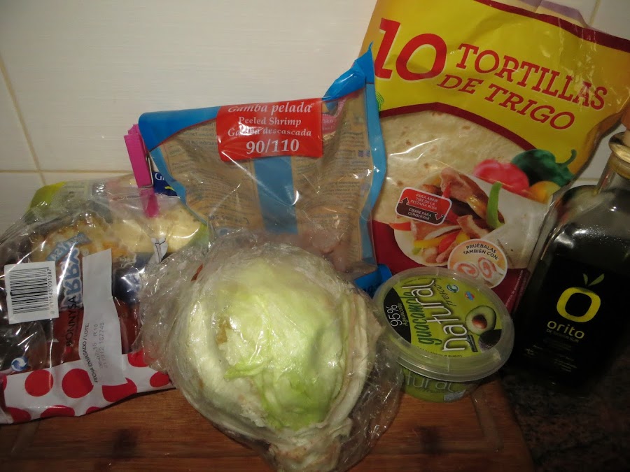 Mientras tanto calentáis las tortillas mejicanas, untáis el guacamole por toda la tortilla y le echáis por encima cortado en trozos pequeños la lechuga, el tomate y esparcís el queso rallado. Una vez que las gambas están cocinadas, las echáis por encima, cerráis la tortilla en forma de fajita y a comer.