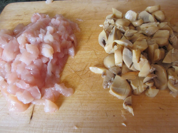 En una sartén con unas cucharadas de aceite, hacemos un sofrito con las cebolla picada, pasados unos minutos añadimos los champiñones troceados, dejamos hacer unos minutos y añadimos el pollo,salpimentamos.