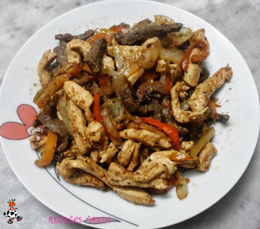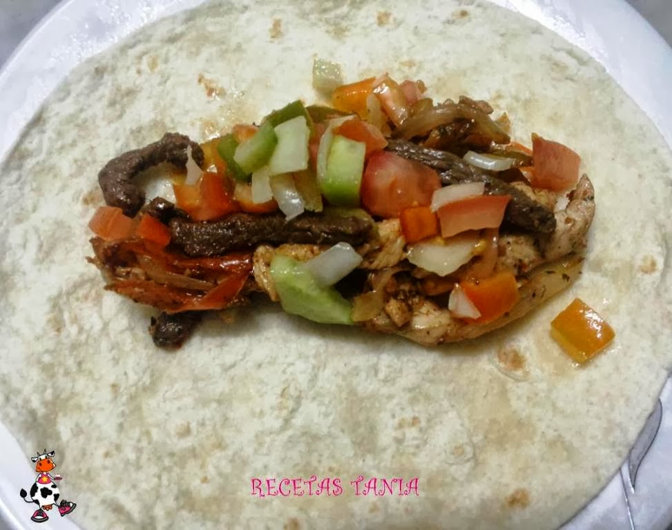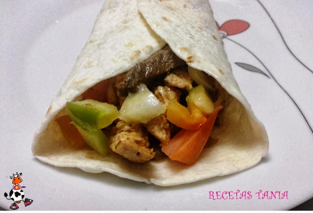 Calentamos las tortillas de trigo ponemos la carne,luego la vinagreta,cerramos la tortilla y a comer!! Esta riquísimas!! :D