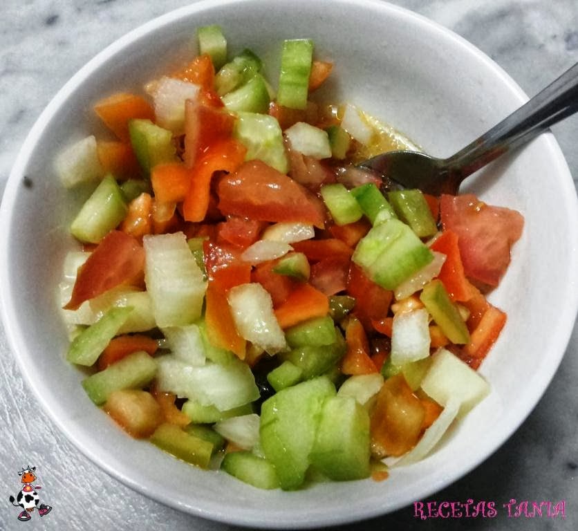 En un bol ponemos un tomate picadito,el medio pepinopicado,un poco de cebolla y pimientos tambien picaditos,añadimos un chorrito de aceite de oliva,un chorrito de vinagre y un poquito de sal,removemos y reservamos. En un caldero ponemos un chorrito de aceite,una vez caliente ponemos la cebolla y los pimientos cortados en juliana,cuando estén doraditos los sacamos y reservamos.