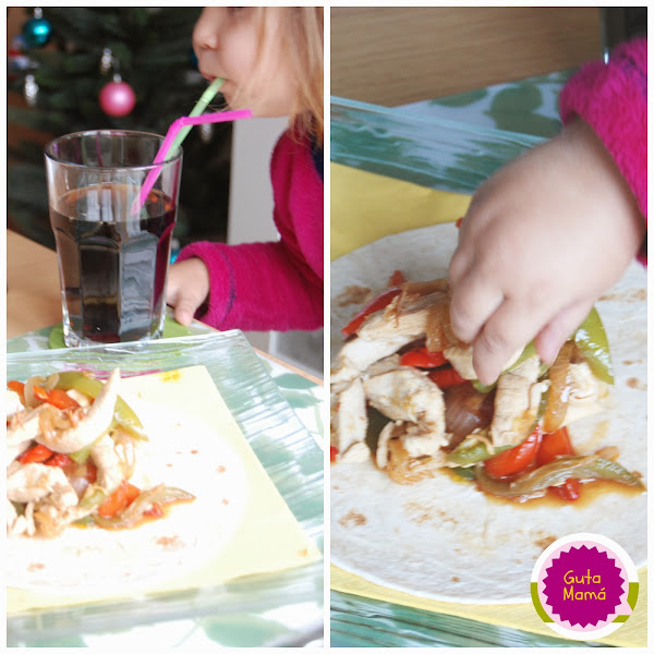 En fin, dejemos al gallo, que hoy el tema va de pollos. Hoy queremos compartir nuestra versión de las fajitas de pollo, uno de los platos más conocidos de la comida mexicana. Hace ya bastante tiempo que encontré esta receta en el blog de JaviRecetas, y desde entonces forma parte de mi recetario habitual, tanto para el día a día, como para alguna otra ocasión informal entre amigos. Ahora, como tengo una pequeñaja, he tenido que cambiar un poquito la versión, sin picantes ni sazonadores preparados, ya que son sabores un poco fuertes para la peque, pero quedan deliciosas igualmente! Así que hoy concedemos la insignia Guta Mamá a esta receta de JaviRecetas, y aprovechamos para felicitarte por tu trabajo y tu buen hacer. Esta no será la única vez, porque cuento con muchas otras recetas tuyas en mi cocina diaria, así que pronto seguro que vuelves a tener noticias nuestras!!