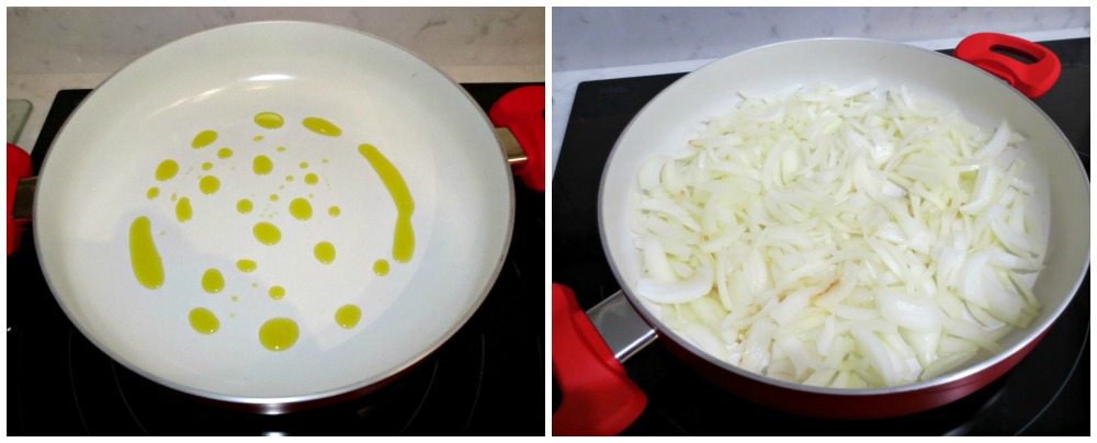 3. Pon una sartén amplia a calentar a fuego medio con un poco de aceite de oliva y cuando esté caliente añade la cebolla. Es importante controlar el calor para que la cebolla no se queme. Lo que queremos es que se vaya pochando poco a poco. Échale una pizca de sal y remueve. Mejor cubrir la sartén con una tapa para que los ingredientes conserven la humedad y aprovechar bien el calor.
