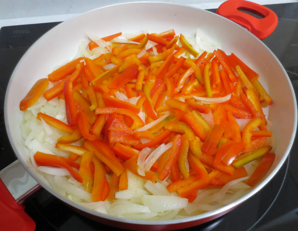 5. Mientras la cebolla y el pimiento se rehogan, trocea los filetes de pollo también en tiras o trozos pequeños.